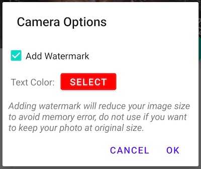 There is an option to add text to photos (watermark) automatically. Please note that this option is only available for photos taken from the camera and will reduce the size of your images to avoid memory errors and also remove the location attribute from photos. Do not use if you want to keep your photo at original size.