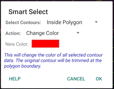 This will change the color of all selected contour data. The original contour will be trimmed at the polygon boundary.